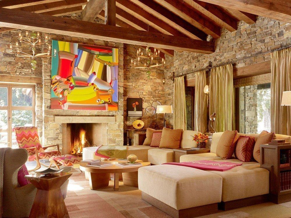 Деревянные балки и белые кирпичные стены в гостиной испанского стиля