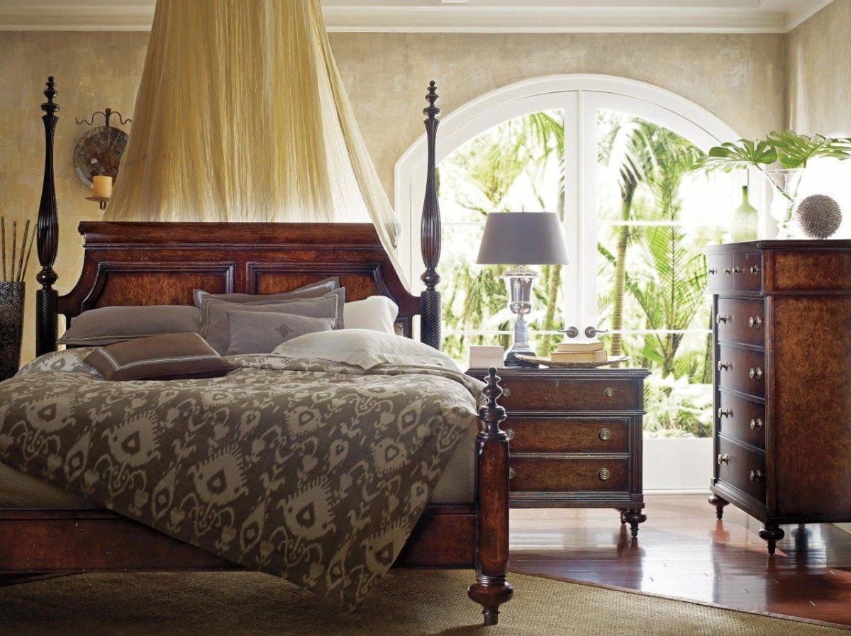 Главным элементом обстановки этой комнаты по праву считается большая кровать с массивным изголовьем. Материалом изготовления спального ложа является дерево, дополненное коваными деталями. При желании ложе оснащают балдахином из лёгкой полупрозрачной ткани.