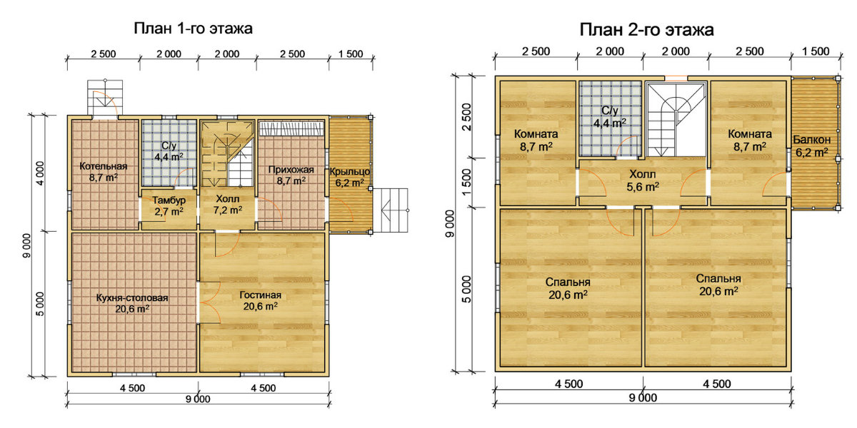 Расположение комнат на первом и втором этаже с отведением места для гардеробнойИсточник Domikbani.ru