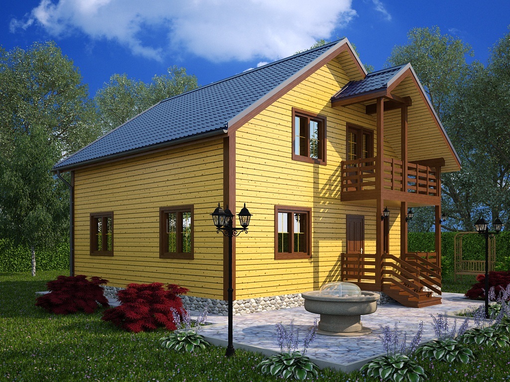 Конструкция дома из бруса 9х9 позволяет легко разместить в нём семью из четырех человек. Расходы на коммунальные услуги также не будут слишком высокими. Типовая планировка каркасного строения с мансардой предлагает множество вариантов эффективного использования пространства. Мансардный этаж может удлиниться визуально за счет размещения балкона на опорных балках. А под балконом можно расположить уютную летнюю террасу.