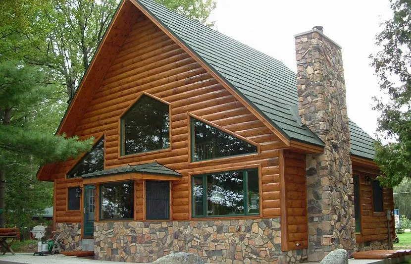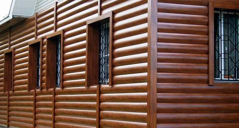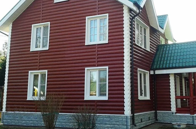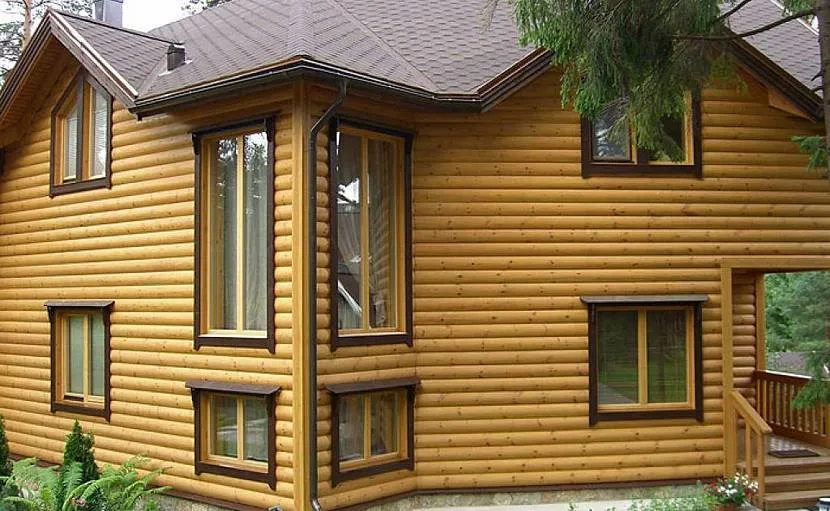 Облицовка на фасаде внешне напоминает древесные бревна. В качестве материала используют не только дерево, но и винил (ПВХ), металл. Имитация натуральной объемной фактуры придает загородному дому элементы деревенского стиля. Сырье долго сохраняет тепло, поэтому используют для улучшения микроклимата жилья.
