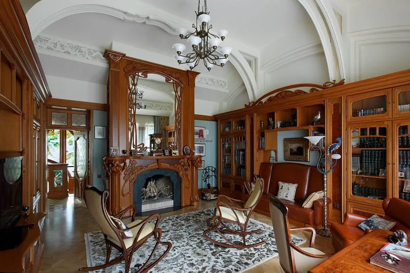 Внесут индивидуальность кованые детали с гибкими линиями: перила лестниц, узорные решетки возле камина. Может иметь ковку и мебель для гостиной в стиле модерн: удобные диваны, красивые резные столы/стулья и др.