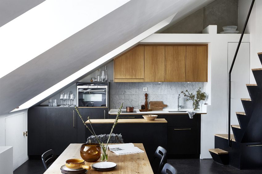 Небольшая аккуратная кухня, обустроенная на чердачном этаже