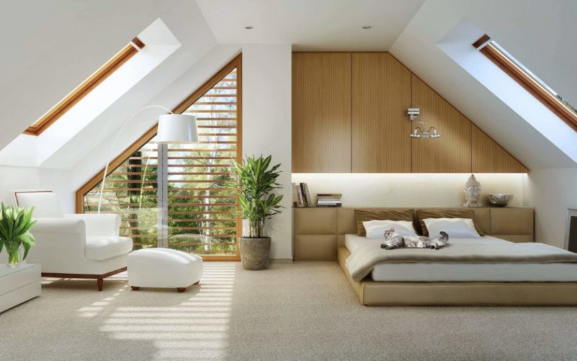 Благодаря мансардным окнам помещение будет освещено естественным светом. Они пропускают достаточное количество солнечного света, а при необходимости можно закрыть окно с помощью римской шторы или жалюзи. Сделать комнату светлее и просторнее поможет большое зеркало.