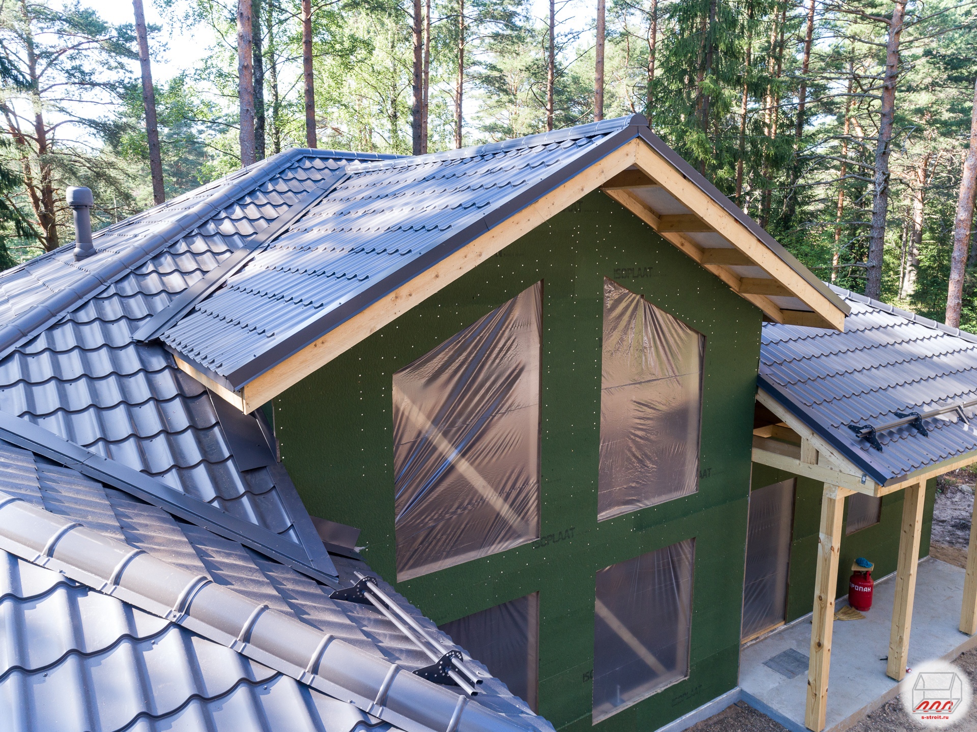 Но, как и автор-вдохновитель, alekspivak, Machete предпочел строить свое «Бунгало Домового» по каркасной технологии, в качестве материала для силового каркаса – доска 150×50 мм. Для удобства расстояние между стойками подогнано под обшивку из ОСП-3. Благодаря второму свету, при габаритах 6×6 м, площадь домика увеличилась примерно до 42 м².