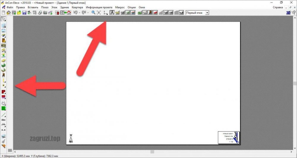 - Когда на предыдущем шаге все настройки будут внесены и кнопка «ОК» нажата, откроется основная рабочая область программы. В правой ее части находится панель инструментов, которая дополняется функционалом верхней панели.