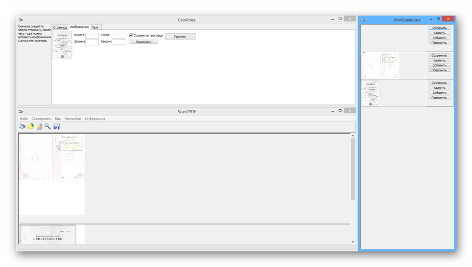 Нажмите «Сканировать». После завершения процесса изображения появятся в библиотеке (в левой части окна). Остаётся настроить выходящий pdf-файл через одноимённый пункт главного меню или контекстное меню самих файлов (вызывается правым кликом): повернуть их, отсортировать, обрезать, подправить в MS Paint или ином редакторе графики, указать размер страницы будущего документа.