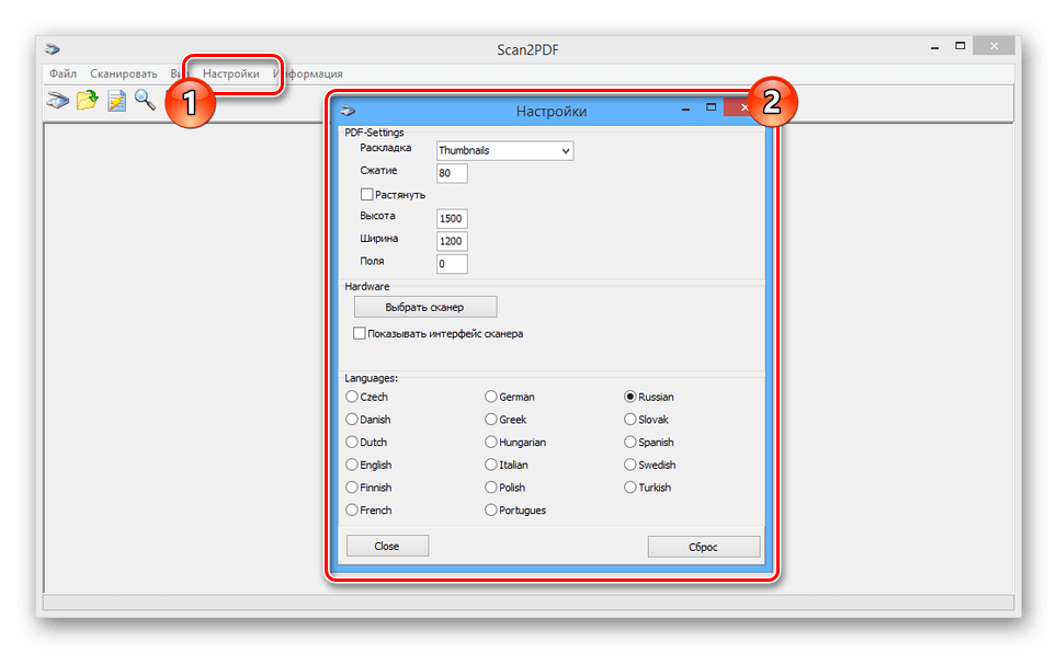 Завершив процесс установки и открыв Scan2PDF, для удобства можно поменять язык интерфейса на «Русский» через раздел «Настройки».