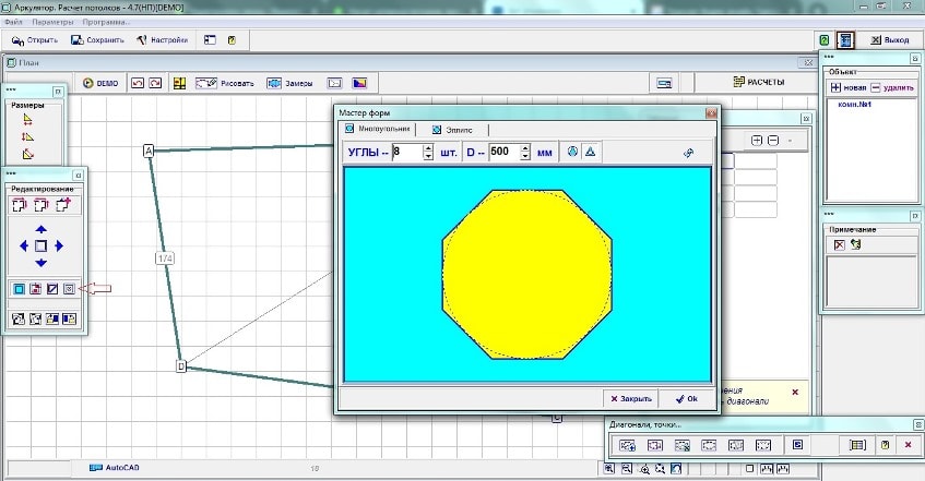 Вставки вырезов простой формы в проект натяжного потолка производятся вызовом окна мастера создания многоугольников.