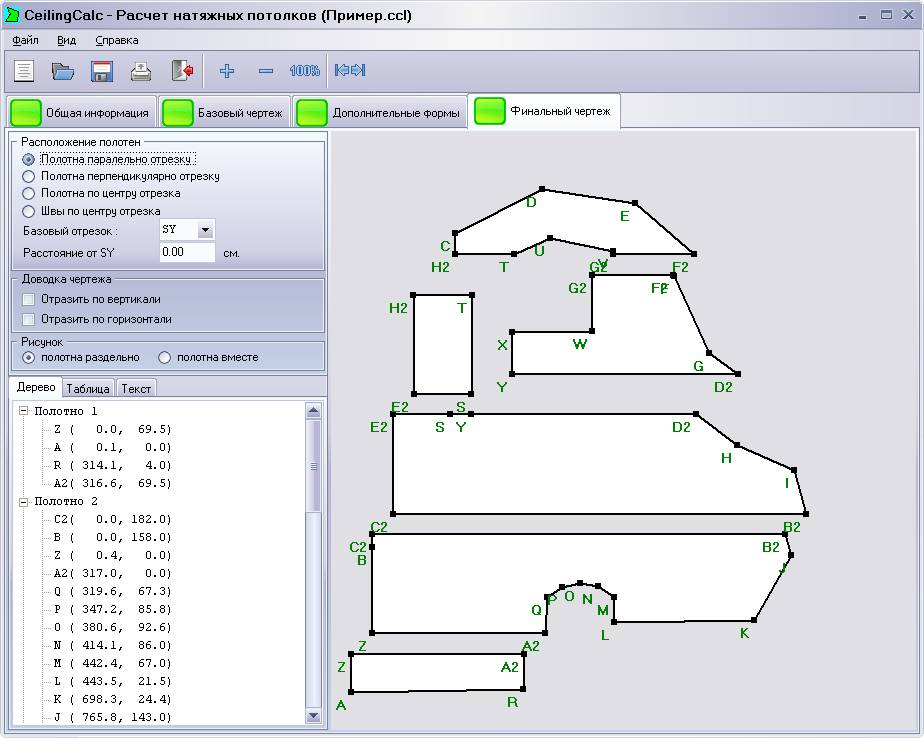 - Позволяет спроектировать натяжной потолок по сделанным замерам и рассчитать параметры полотен