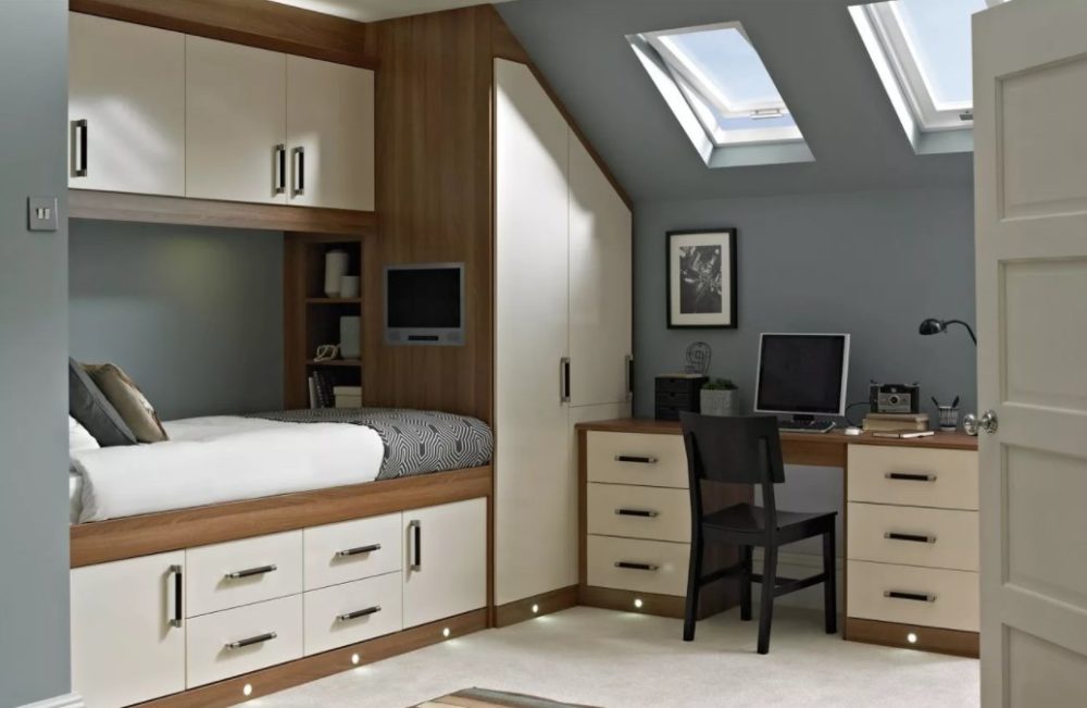 Встроенная мебель особенно актуальна в комнатах сложной конфигурации, например, на мансарде Предметы обстановки должны располагаться так, чтобы они не создавали препятствия при передвижении по комнате, не мешали открыванию створок шкафов и выдвижных ящиков.