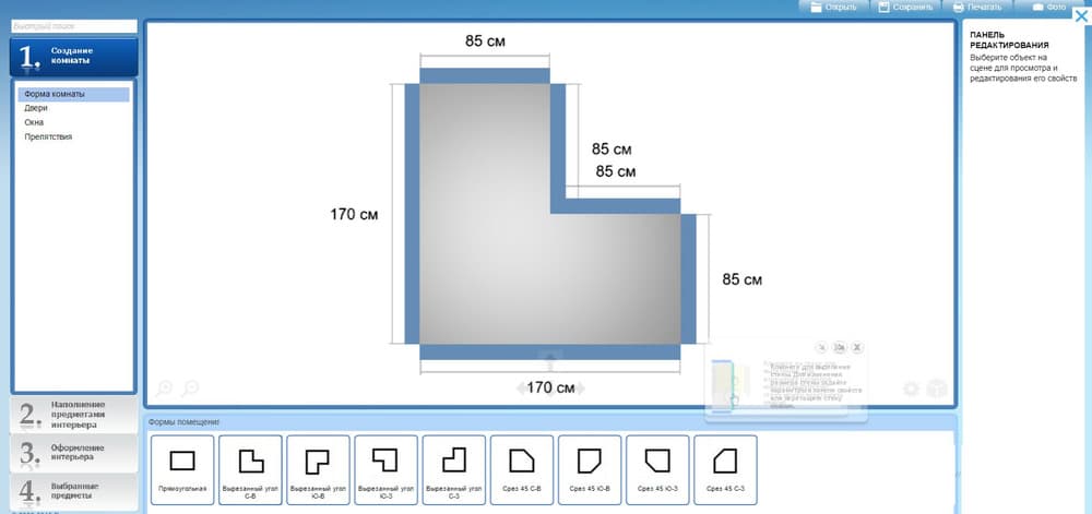 Еще один понятный и увлекательный онлайн-сервис для создания дизайна интерьера. Можно ввести свой план планировки и уже оперировать им. Для работы нужно зарегистрироваться.