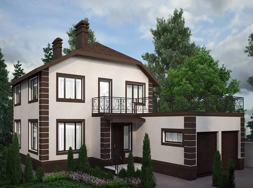 Возведение коттеджа, имеющего два яруса, позволяет максимально сэкономить площадь участка и использовать ее для сооружения хозяйственных и других построек. Двухэтажные конструкции смотрятся более презентабельно и уютно, причем открываются дополнительные возможности для реализации дизайна. Чертеж коттеджа такого типа может включать в себя балкон, украшенный балюстрадой. Архитектурных решений для отделки фасадов в этом случае существует гораздо больше.