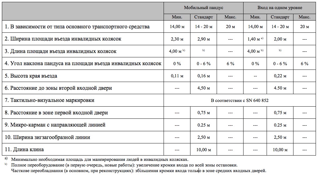 b) Полное переоборудование (прежде всего, новые сооружения): увеличение кромки входа (края посадки) по всей зоне остановки.Частичное переоборудование (прежде всего, при реконструкциях): увеличение фронта посадки (бордюра) только в зоне средней входной двери.
