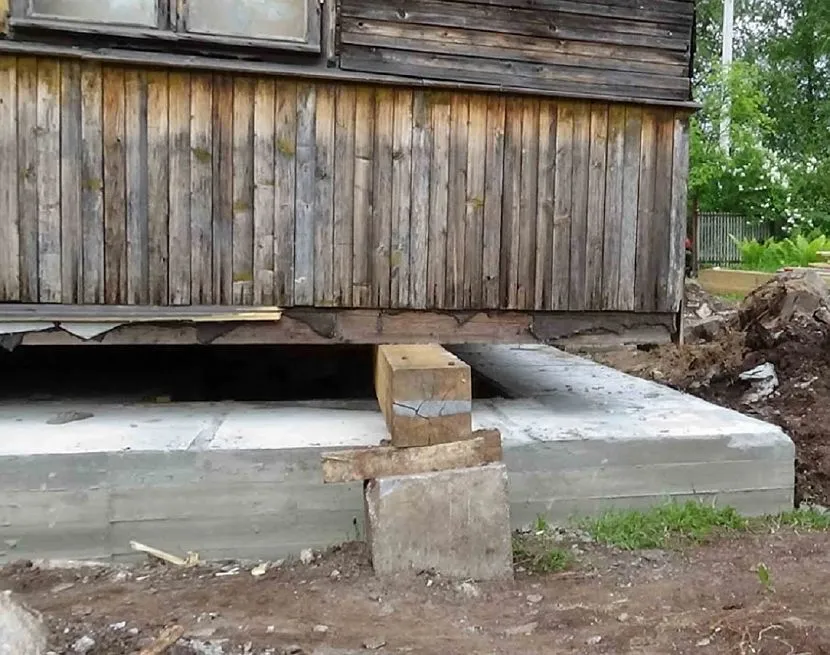 Для уменьшения веса из помещений выносят мебель, бытовую технику и разбирают пол. Нижние венцы соединяют скобами из стали. Домкраты располагают вдоль длинных перегородок, отступая от углов по 0,5 м. Под устройства ставят плиту из бетона, толщиной 50*50. В качестве временной опоры можно установить:
