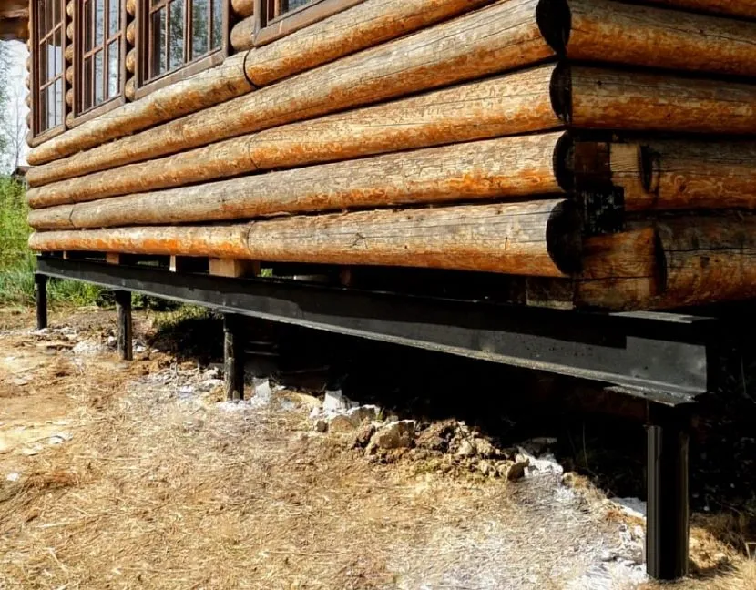 Процедуру легче проводить в несколько этапов. Первыми под строение подкладывают опоры. На участках пересечения стен и центра на уровне 15 см рекомендуем ставить временные столбы. Если во время подъема перегибается нижнее бревно, то используют еще один домкрат в проблемной зоне.