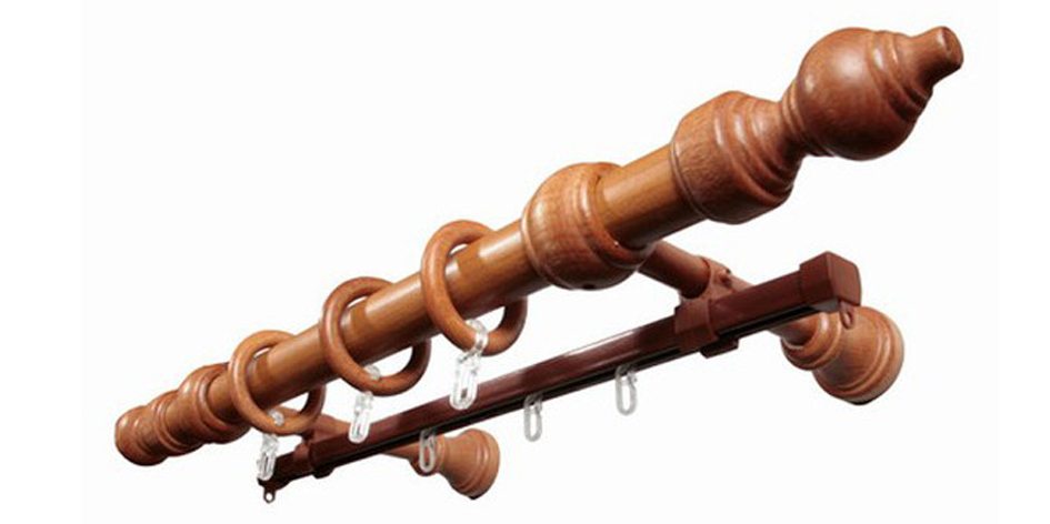 Резные изделия для штор из дерева свободно скрывают конструкции, состоящие из 2 и 3 рядов. Круглое устройство предусматривает отдельный ряд для занавесок. Самым популярным является двухрядный карниз.