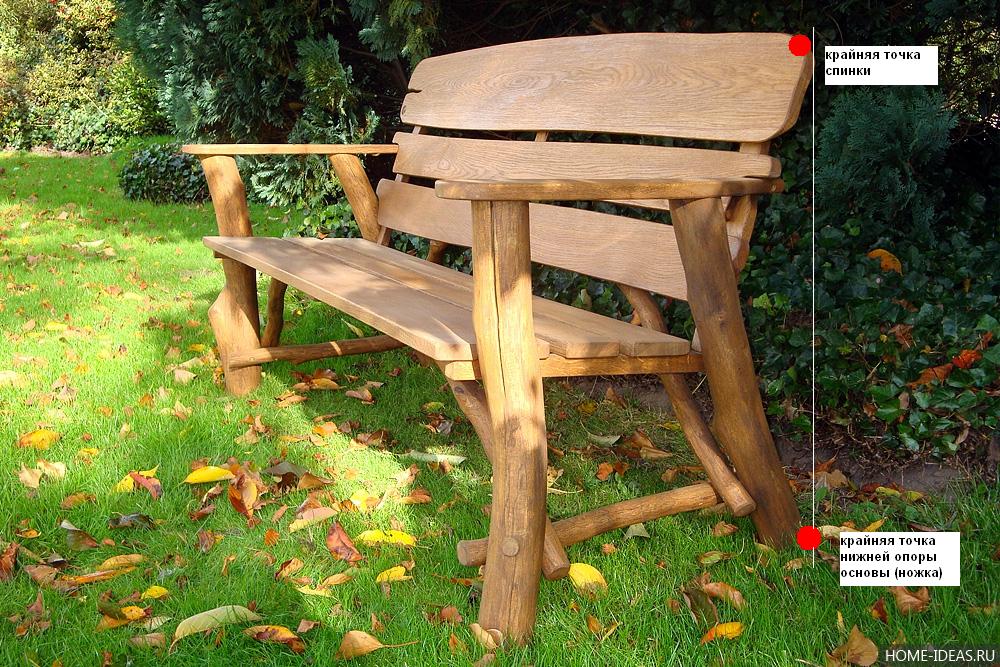 Чтобы центр тяжести не сместился так, что скамейка опрокинется, или будет шататься, – верх спинки не должен выходить за вертикальную ось, проходящую через крайние точки нижних опор, ножек. Лучше, если ножки будут выступать дальше, чем спинка скамьи.