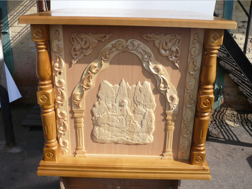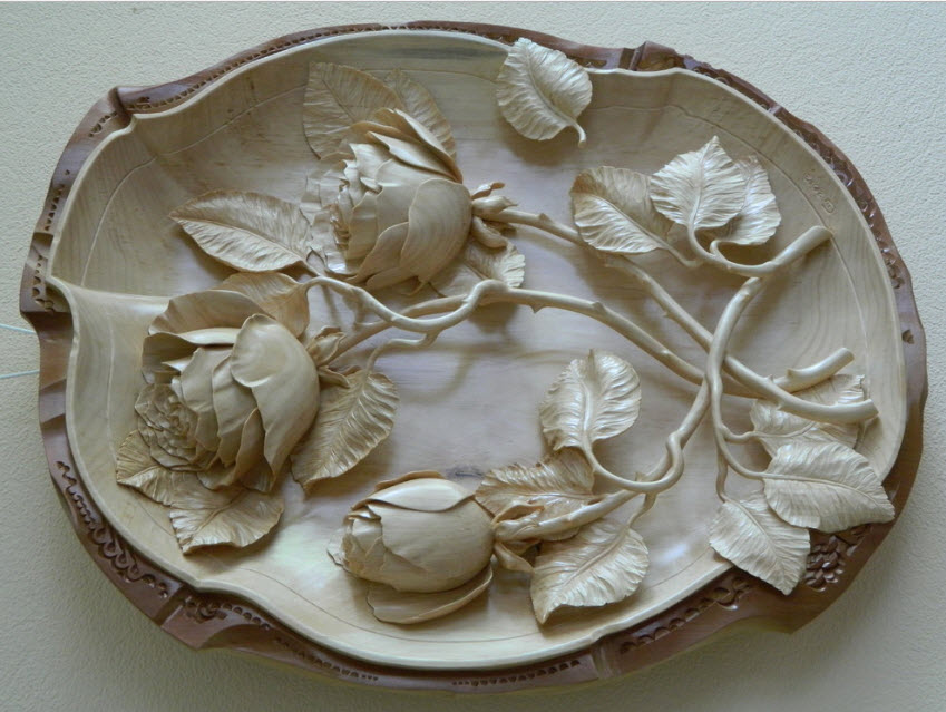 Характерный объём придают вещам с помощью рельефной резьбы. Главное требование в этом случае — выполнение рисунка на одном уровне с общим фоном или немного выше него. Плоскорельефный вид резьбы предполагает подушечный и выбранный фон. В первом случае фон и рисунок должны располагаться на одном уровне, во втором — рисунок выполняется выше полученного фона.