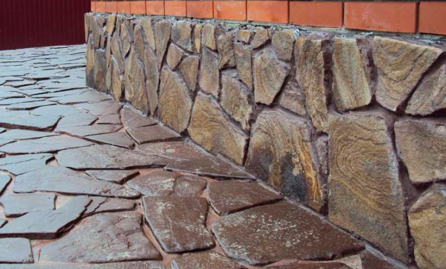 Производители предлагает владельцам заменить дорогой камень на искусственный аналог. Благодаря большому выбору можно подобрать материал разной фактуры (мрамор, речной и др.), цветов и размеров. Монтаж производят на чистую поверхность с помощью клеевого раствора. Чтобы продлить срок службы искусственного камня, готовую кладку покрывают специальным укрепляющим раствором.