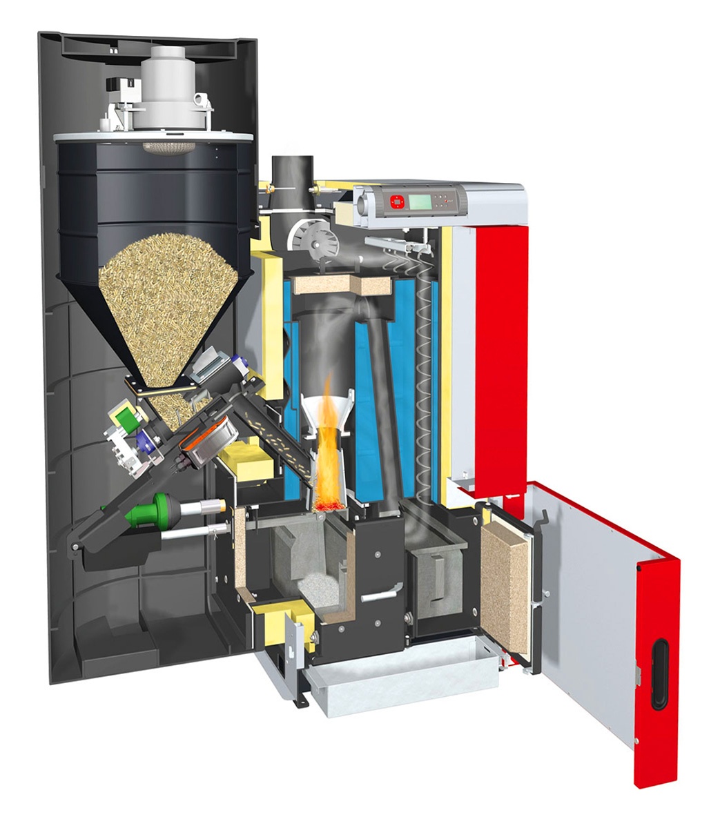 Пеллетные котлы отопления состоят из топливного бункера, автоматической системы и горелки. По внешнему шнеку сырье подается в отделение предварительной топки (предтопки), затем через желоб внутреннего шнека гранулы транспортируются на форсунку горелки. Благодаря гранулированному составу брикетов топливо рассыпается на отдельные мелкие фрагменты – гранулы горят на форсунке, которая разжигается в автоматическом режиме.