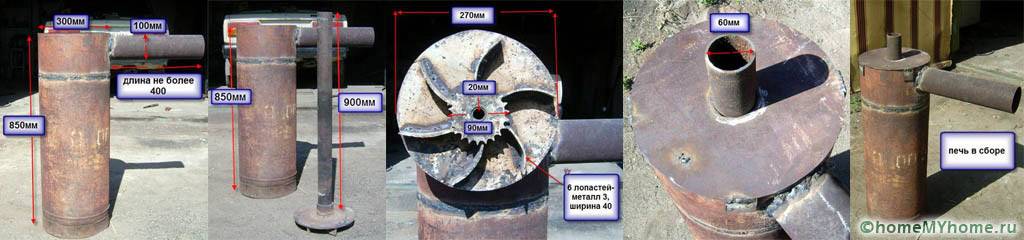 В верхней части самодельной конструкции делается выпускной патрубок, с помощью которого отработанные газы будут поступать в дымоходную трубу. По бокам посредством сварки фиксируются патрубки, необходимые для подсоединения к отопительной системе строения. В них обязательно нарезается резьба.