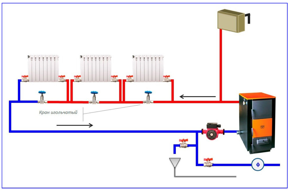 Схема водяного отопления частного дома может использовать как байпас с ручным, так и с автоматическим управлением. В последнем случае в контуре обвода циркуляционного насоса монтируется обратный клапан.
