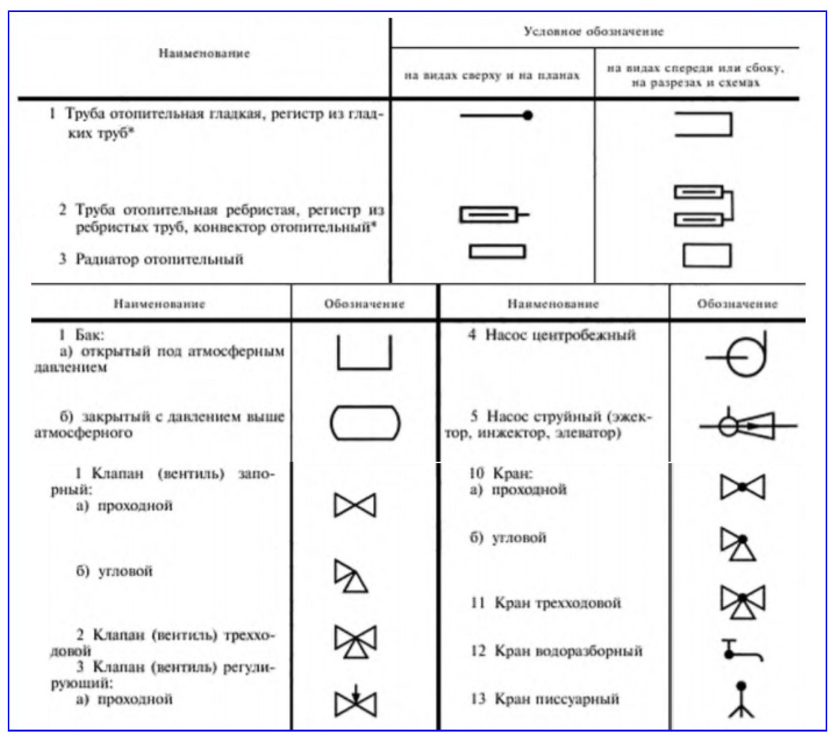 Рис. 4 Условные обозначения на схемах элементов отопительных систем по ГОСТ 21.205-93