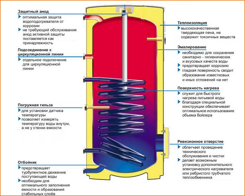 На внутренней поверхности прибора имеется слой бакелитового лака. Он предохраняет буферную емкость от агрессивного влияния технической горячей воды, слабых растворов солей и концентрированных кислот. На внешнюю сторону агрегата наносится порошковая краска, стойкая к высоким термическим нагрузкам.