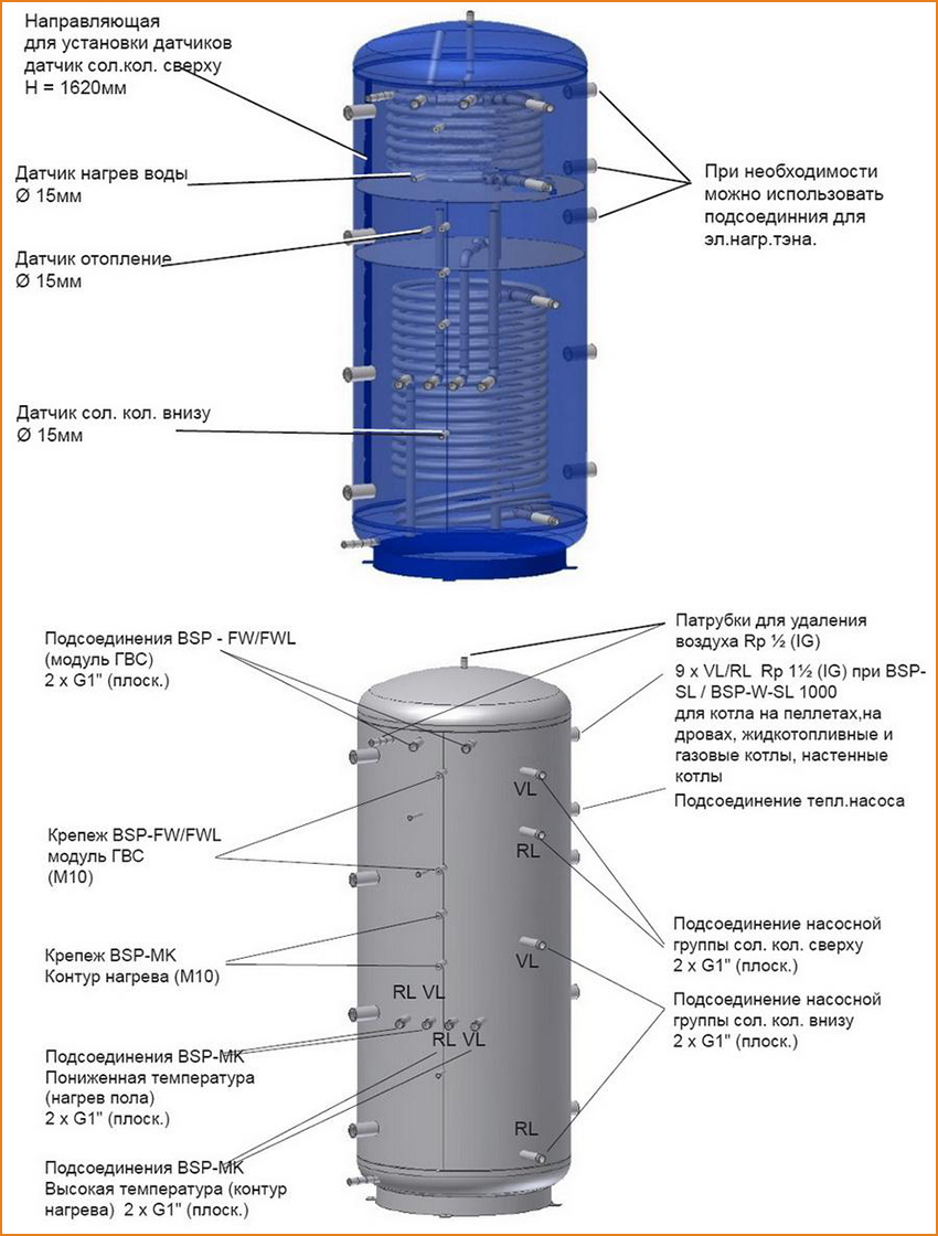 - Теплоаккумулятор с 2 и более змеевиками или 2 или более ТЭНами