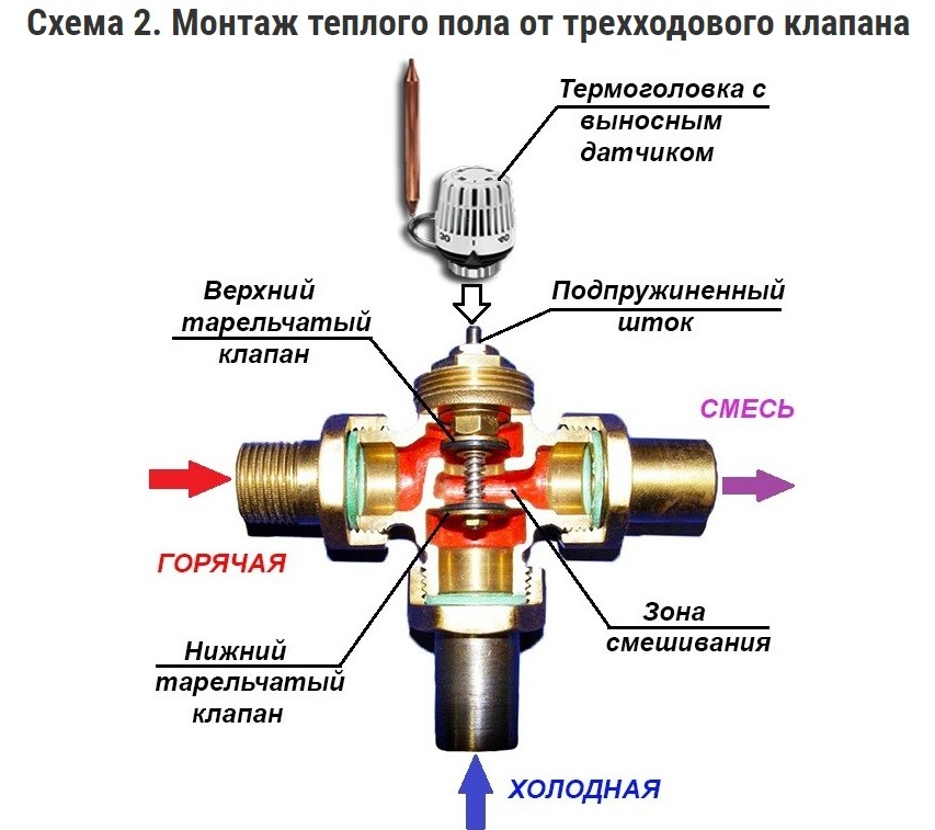 Перед тем как подключить теплый водяной пол, вы должны будете ознакомиться с той или иной схемой, которую предполагается использовать. Если система предусматривает наличие трехходового клапана, то радиаторы отопления должны будут иметь температуру в пределах от 70 до 80 ˚С, а контур теплого пола должен обладать температурой 40 ˚С. В этом случае возникает закономерный вопрос о том, как из первого значения сделать второе. Для этого и нужен трехходовой клапан, который устанавливается на подаче.