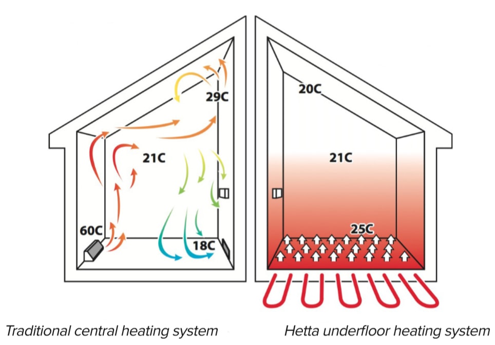 Маркетологи обычно приводят следующий пример. Радиаторы сначала обогревают потолок, потом пол, ввиду чего весь эффективный тёплый воздух оказывается вверху, в то время как полы сохраняют наиболее эффективную и комфортную температуру внизу, а к потолку оказывается прохладнее. Именно поэтому радиаторы имеют меньшие размеры (по сравнению с тёплым полом) и работают на более высоких температурах, они компенсируют схему своей работы таким образом, и общая температура помещения оказывается такой же.