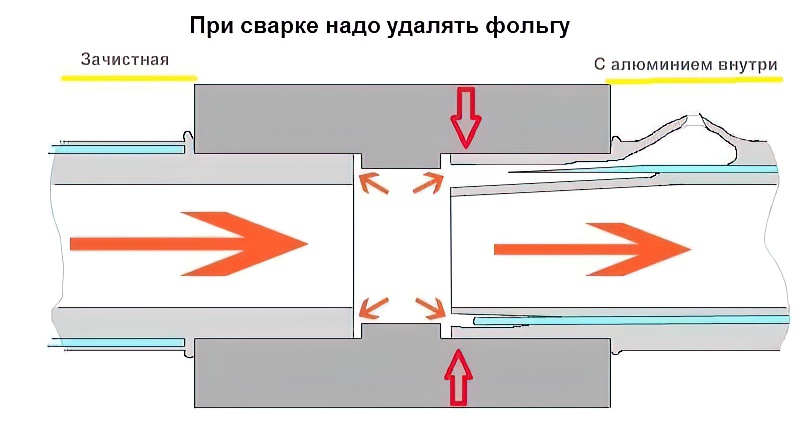 используют фитинги. Сам процесс сварки идентичен для всех типов, разница в том, что при наличии алюминиевой фольги требуется предварительная обработка — необходимо удалить фольгу на глубину пайки.