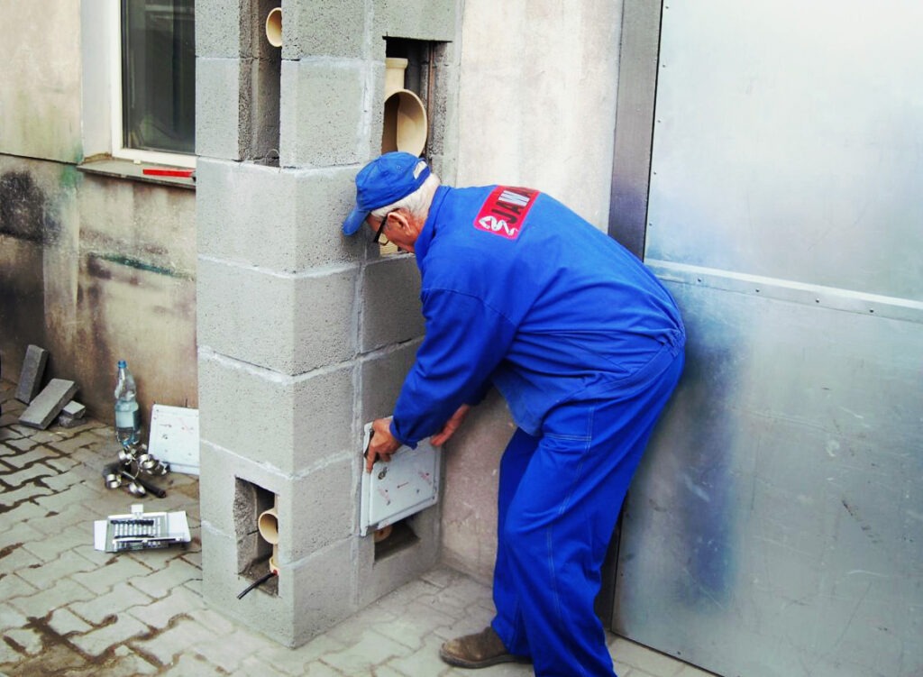 Затем нужно установить теплоизоляционные плиты и выполнить монтаж наружных блоков. После этого необходимо обшить трубу для отвода продуктов горения при помощи особого жаростойкого гипсокартона. Также для этой цели подойдут цементно-стружечные плиты.