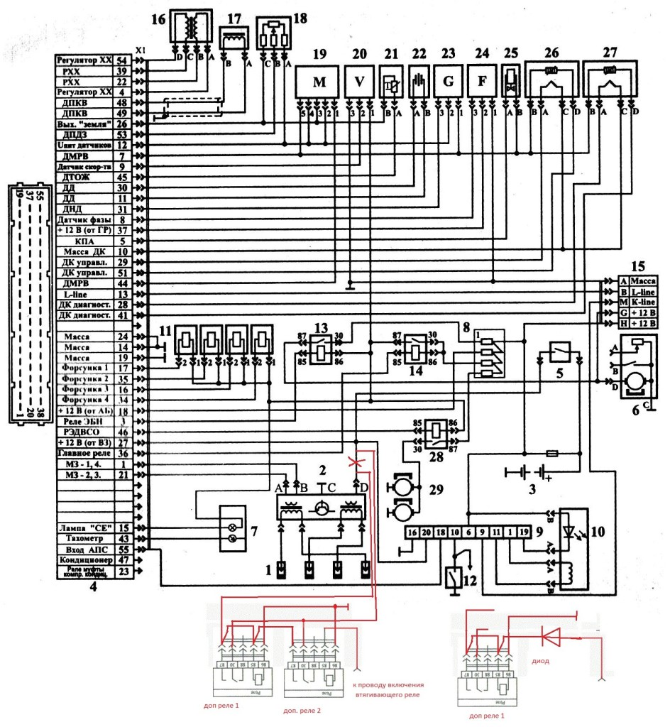 Вместо дополнительного реле 2 можно использовать диод, причём большой мощности его не требуется. Если на машине установлен модуль типа СОАТЭ 2111.3705-03/0433705 с тремя проводами, а именно на них чаще всего происходит хлопок, то схема его подключения практически такая же, только отсутствует минусовой провод от модуля.