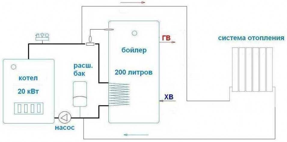 Если бойлер применяют редко (например, сезонно или по выходным) или появилась необходимость в воде, температура которой ниже, чем в системе обогрева, применяют схему с двумя Система водяного отопления с принудительной циркуляцией: схемы, варианты реализации, технические тонкости циркуляционными насосами. Первый устанавливают на трубе подачи, непосредственно перед БКН, второй – на контуре отопления.