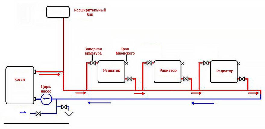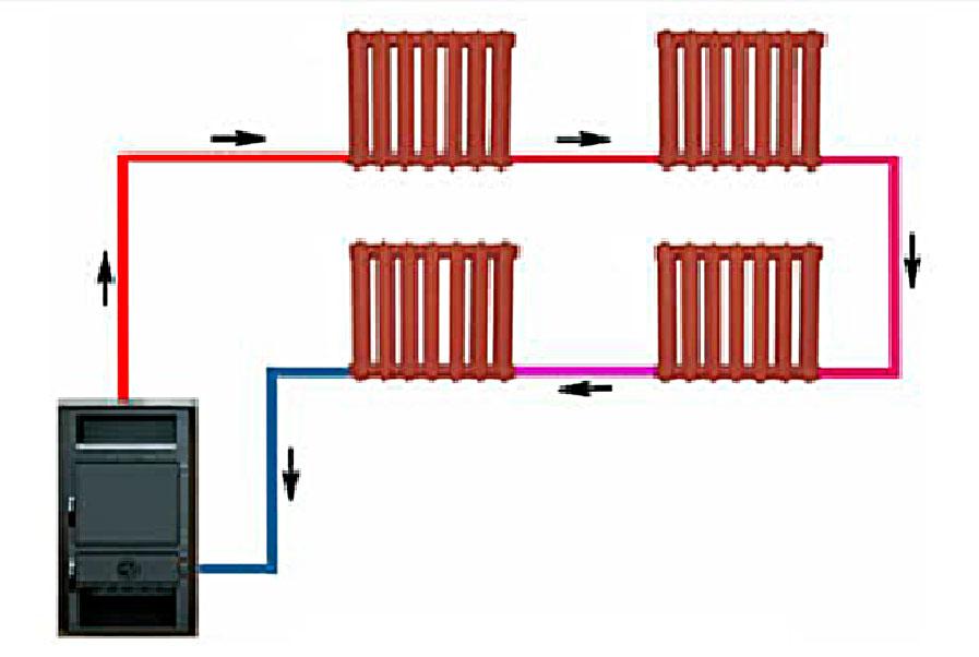 В этой системе ближний к котлу радиатор прогревается сильнее, а последний получает теплоносителя меньше других. Для тупиковой схемы количество радиаторов в каждом плече ограничено. Трубы используются такие же, как в Ленинградке.