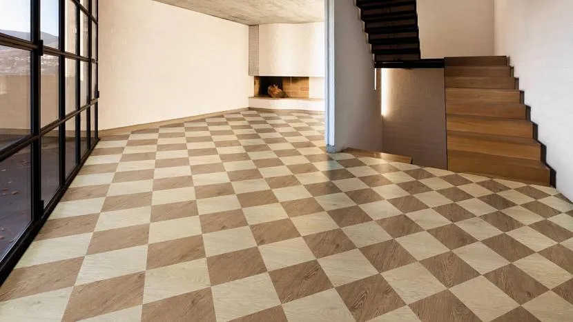 Кварцвиниловая плитка, выложенная в коридоре в шахматном порядкеИсточник dizainexpert.ru