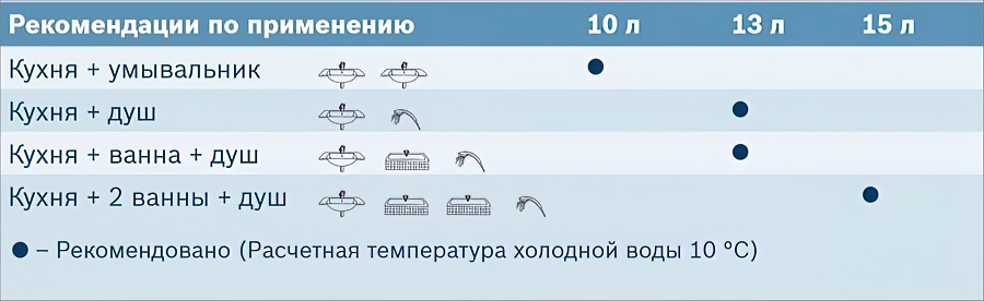 Для семьи из 1 — 2 человек обычно хватает производительности колонки 10 литров в минуту, что соответствует мощности 17 — 18 кВт. Если замена прибора связана с желанием использовать одновременно две точки водопотребления, например, мойку и душ, то производительность газового нагревателя должна быть не менее 13 л/мин.