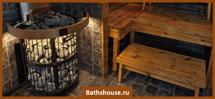 Каменка здесь закрытая, но с большим количеством вентиляционных отверстий, чтобы тепло распределялась быстро и равномерно.