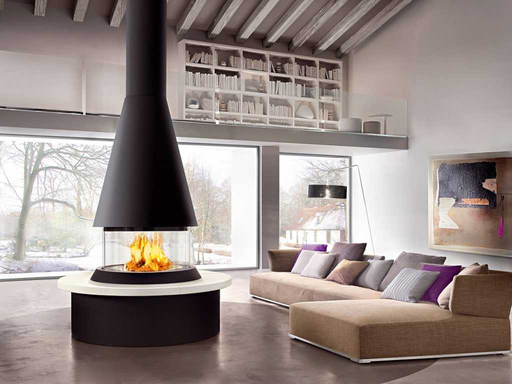 Островные камины, как правило, устанавливаются так, чтобы обозрение огня было со всех сторон. По сути – это грамотно оборудованная жаропрочная площадка, установленная на качественном напольном покрытии с выводом дымохода. Хотя, в таких каминах устраивается заграждение огня из стекла, его использование требует повышенной безопасности.
