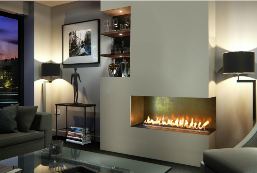 Камины, которые прилегают к стене торцевой стенкой. Предпочтительный вариант для комнат, имеющих среднюю площадь, которую, в свою очередь, можно условно разделить на две отдельные зоны. В случае сквозной топочной камеры будет иметь места пара стеклянных дверок, по одной на каждую сторону.