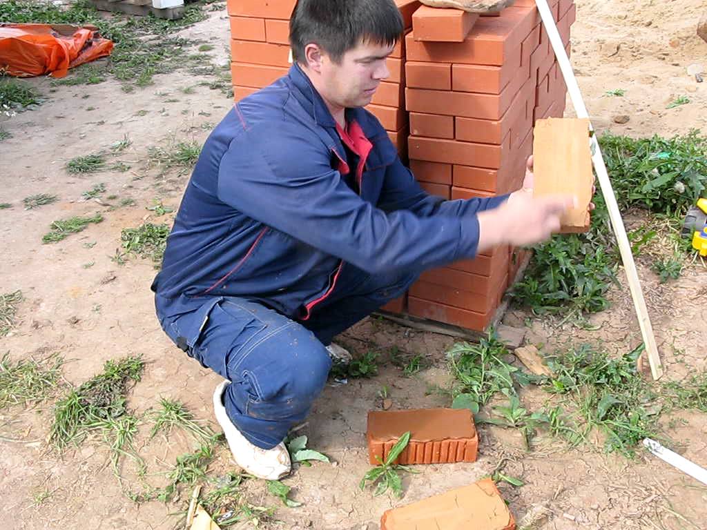 После того, как будут определены размеры, можно начинать выкладывать первый ряд по натянутому шнуру. Укладывать слой нужно начинать целым кирпичом, после этого ряды чередуются с половинками. Это позволяет добиться красивого рисунка.