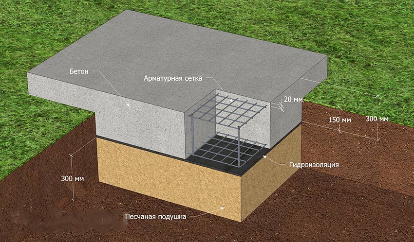Так как высота сооружения не будет превышать 90 см, то она имеет небольшой вес. Поэтому для основания достаточно просто залить слой бетона толщиной до 12 см, и дополнительно укрепить армированными прутами.