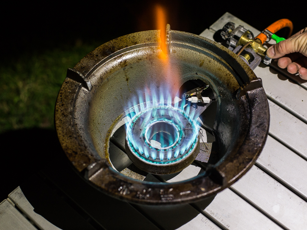 После завершения сборки всего аппарата, требуется выставить оптимальное давление в баллоне. Перед поджигом горелки следует тщательно проверить всю систему подачи газа, смешивания с воздухом на наличие возможных утечек. Если они проявились, их обязательно необходимо устранить. Только после всех проверок можно зажигать горелку. Горелка должна обеспечивать длину горящей струи до 50 мм.