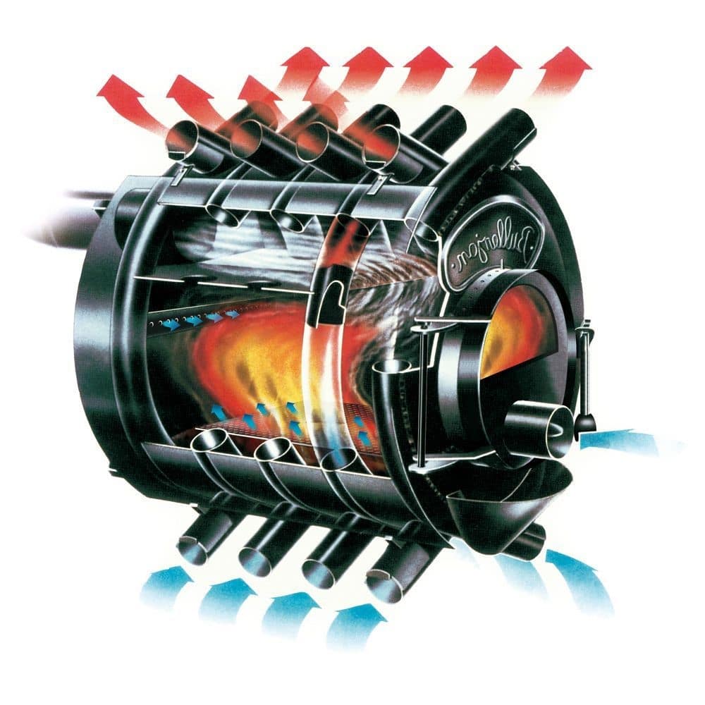 Работа печи основана на принципе конвекции. К объемной вторичной камере, в которой происходит процесс сжигания дров, подведены трубы для теплообмена. Принцип их действия очень прост. Холодный воздух поступает в трубу у основания печи Булерьян, а затем выходит уже разогретым в верхней части конструкции.
