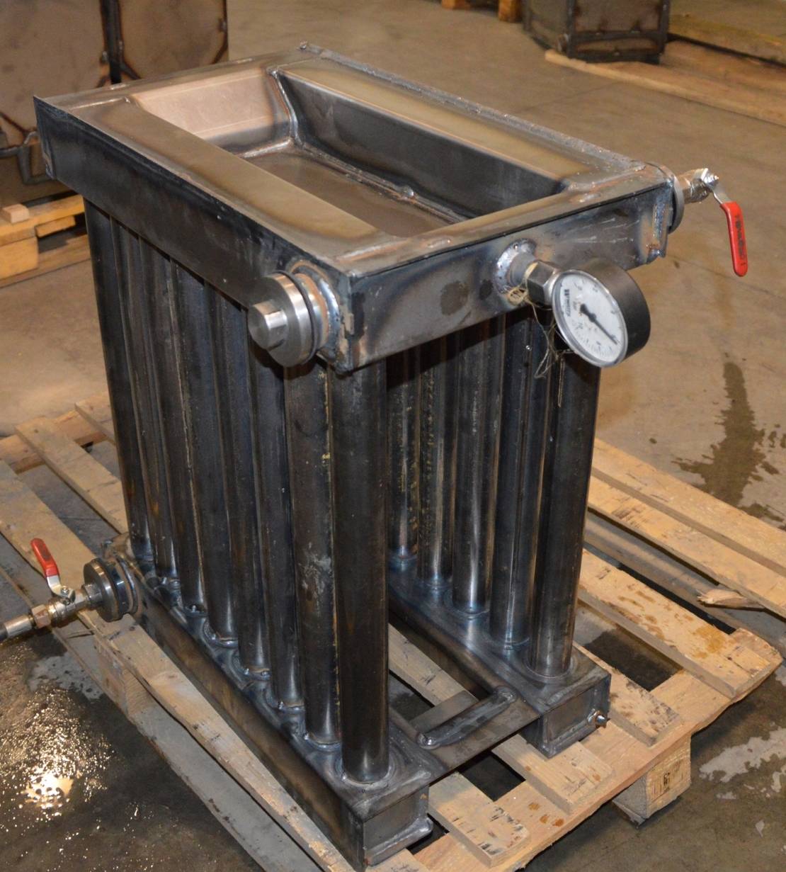 - Конструкция. Печной теплообменник может изготавливаться из листового металла в форме емкостей (котлов), круглых или профильных металлических труб, сложных металлических конструкций (например, отопительная батарея).
