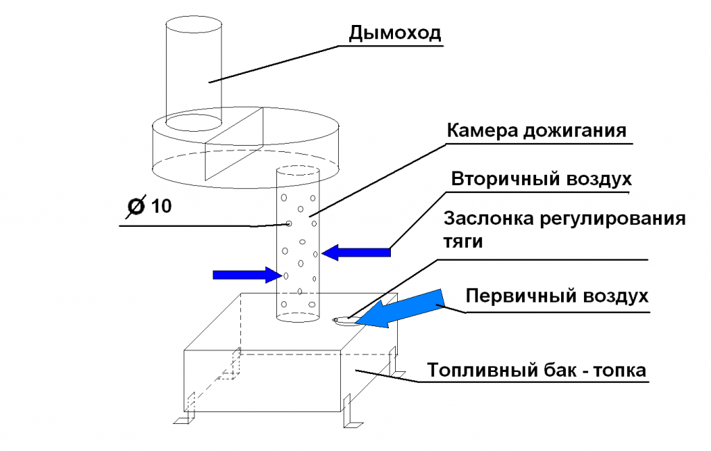 После закипания топлива (не горения, а лишь закипания) образующиеся летучие вещества попадают через трубу в камеру вторую. Одновременно при переходе через нее газы будут насыщаться кислородом, способствующем горению. Для этих целей в трубе предусматривается перфорация. Воспламеняться газы начинают уже в трубе, а догорают во второй камере. Причем подача должна осуществляться небольшими дозами.