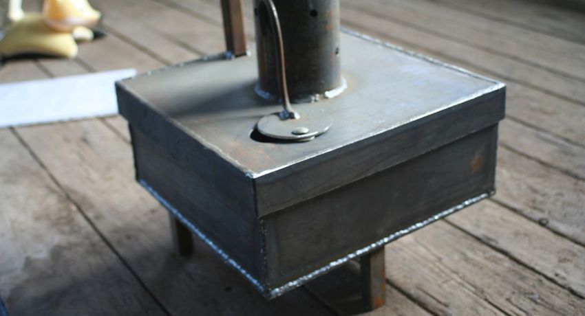 - Из куска подходящего листа выгибают корпус зольника и приваривают его. К дверце приваривают петли и навешивают ее на место.