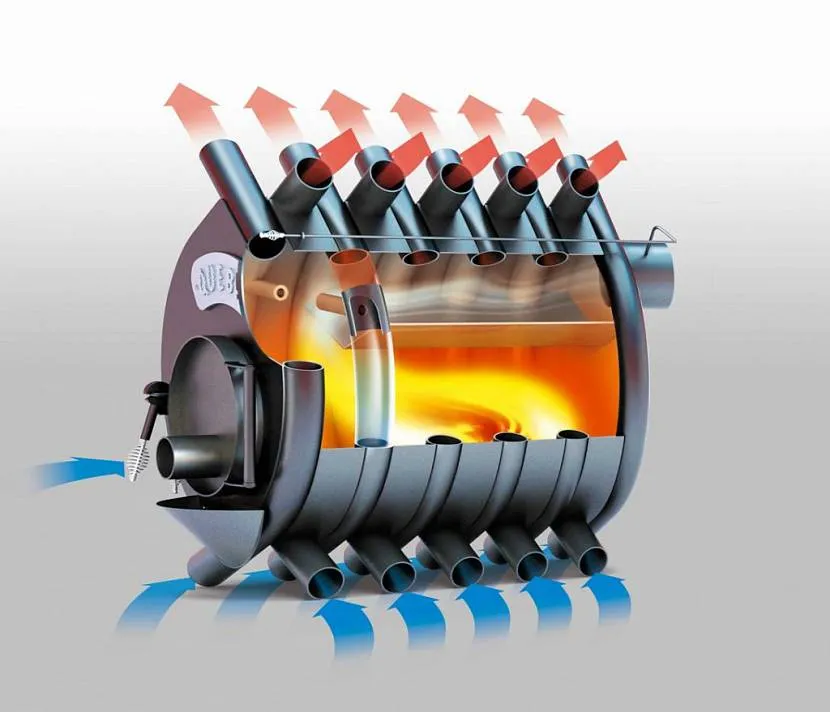 В безвоздушном пространстве огонь не горит. Поэтому в камеру сгорания он поступает через заслонку (жиклеры, каналы) в количестве необходимом для того, чтобы дрова тлели, а не горели. Таким образом, в трубах прибора поддерживается постоянная температура, передающаяся проходящему через них воздуху. Кстати, их правильное название «конвекционные трубы».